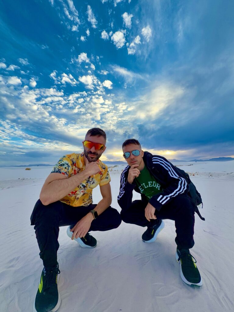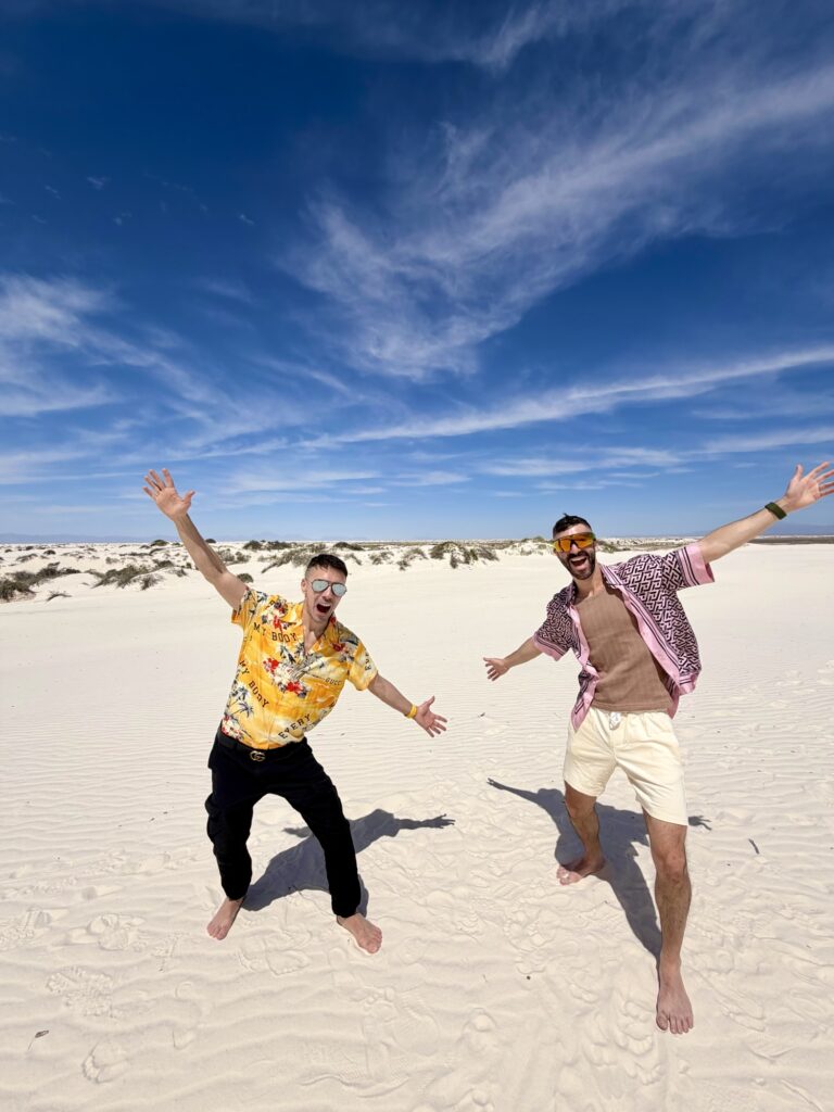 This was one of those classic Borderless Bros adventures: a little chaotic, a lot packed in, and full of moments that swung from awe to absurdity in the best possible way. We went from Santa Fe plazas and Jamaican vegan food to walking barefoot across the surreal white dunes of New Mexico, descending into the enormous underground world of Carlsbad Caverns, embracing the kitschy alien energy of Roswell, and then trading desert quiet for the glittery overstimulation of Los Angeles and Coachella.